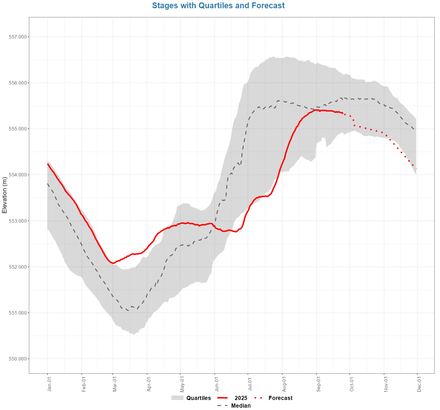 - The reservoir is at 555.34 m. This level is between lower quartile and median range levels for September. Levels are expected to continue to slowly decline.