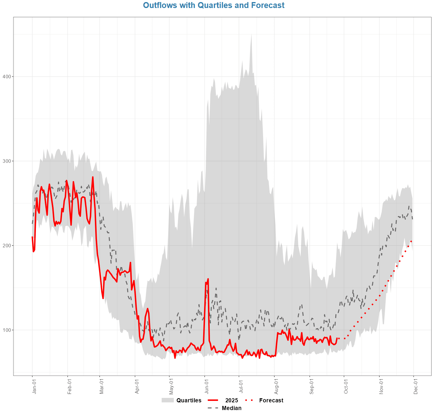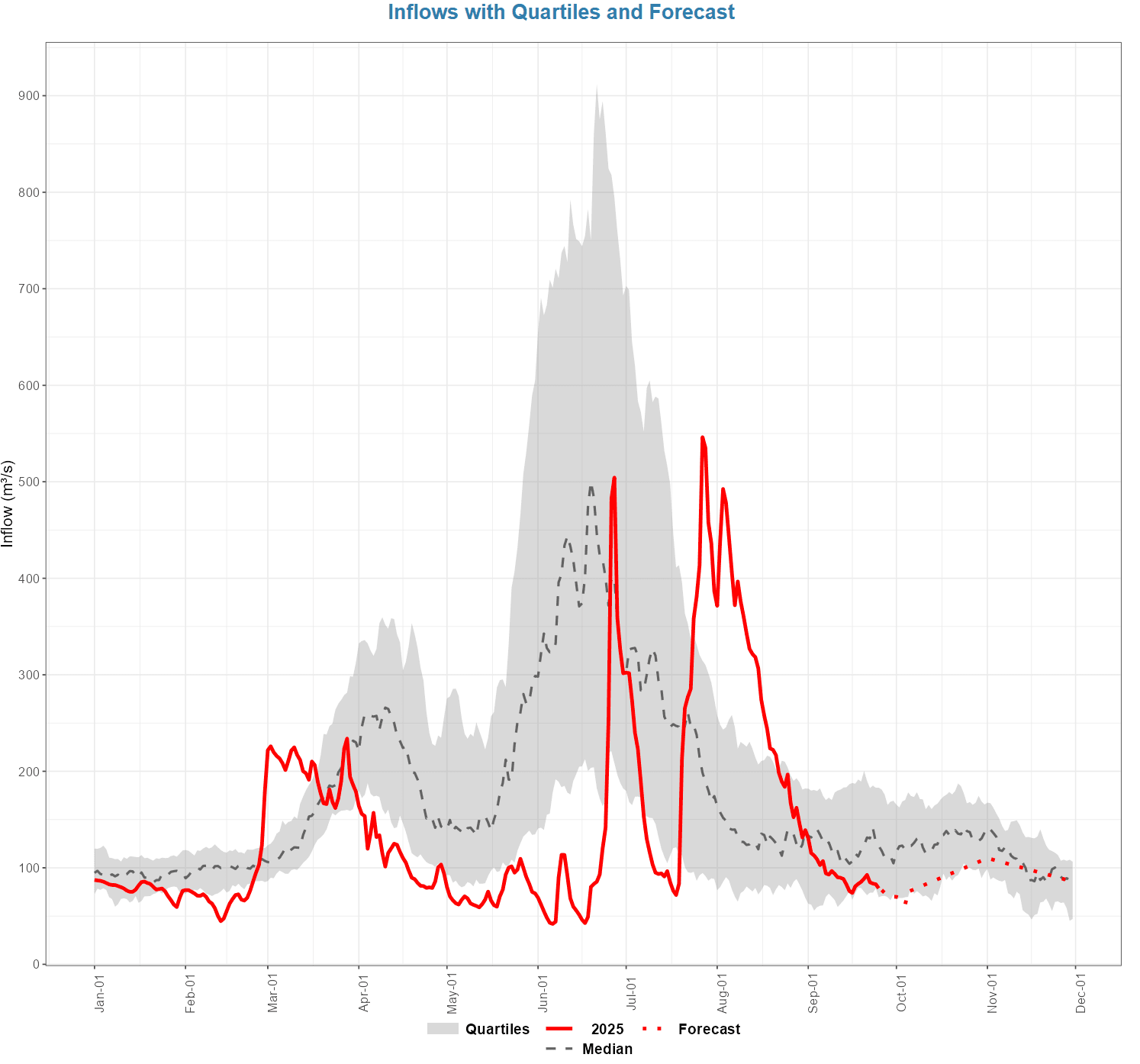 - Here are the updated plots showing 2025 observed inflows, outflows, and reservoir elevation compared to historical ranges with the forecasts.