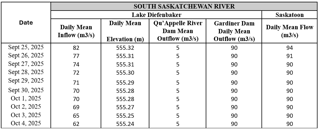 - Outflows from Lake Diefenbaker are expected to remain near 90 m³/s.