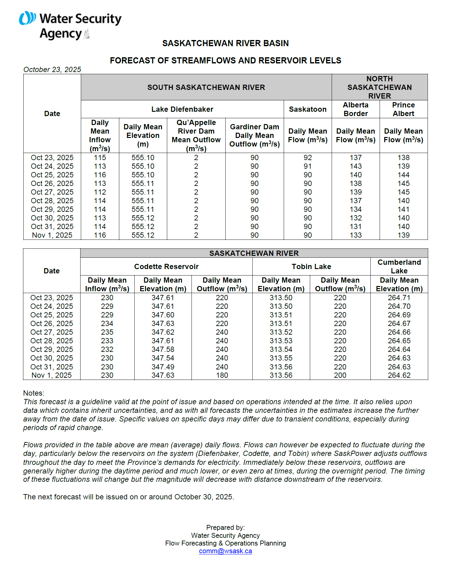 - Inflows into Lake Diefenbaker are expected to remain steady near the lower quartile level.